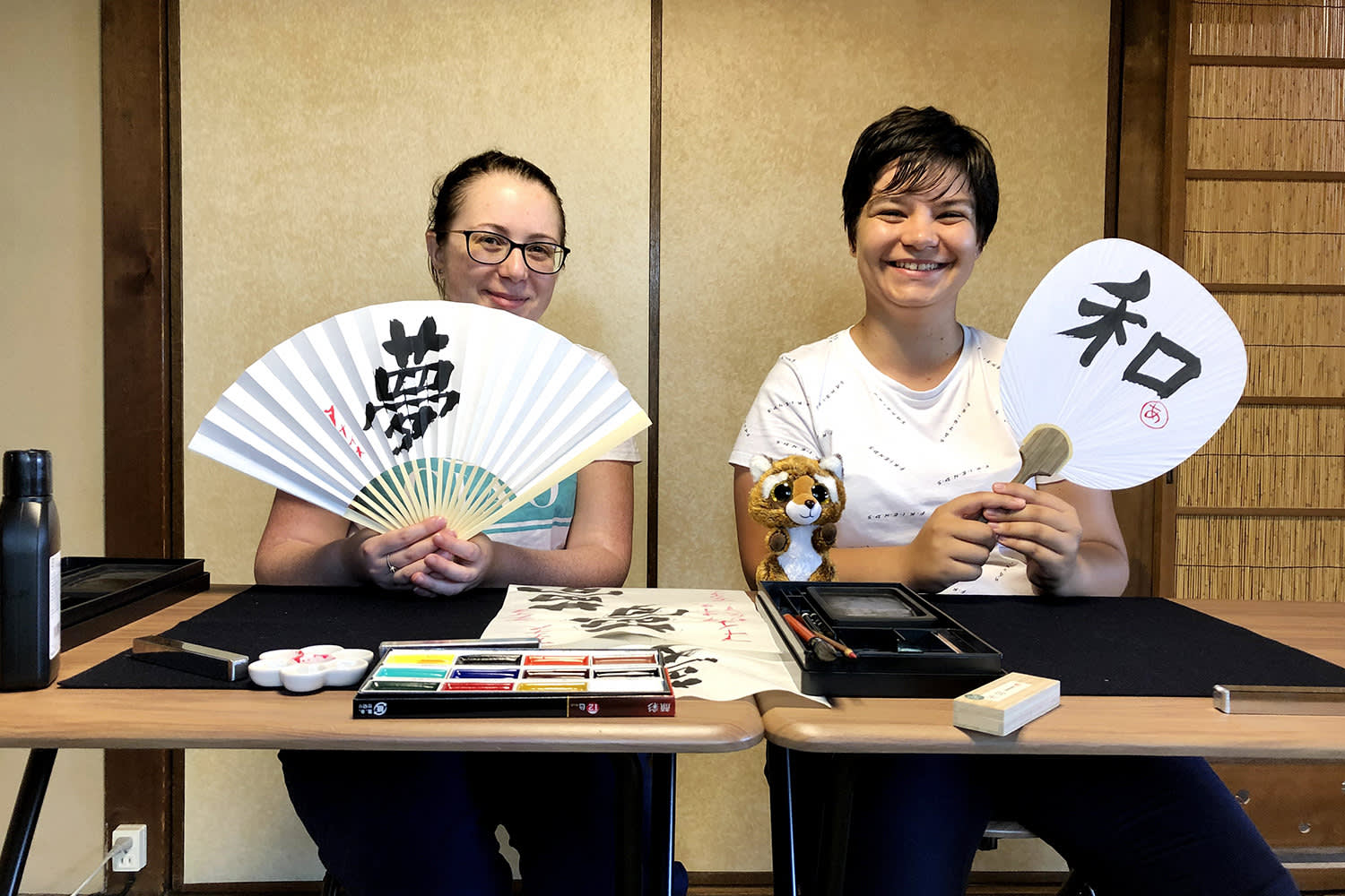 Depending on the course, visitors may write on paper fans or other souvenir items. The teacher will help choose the appropriate characters to write.