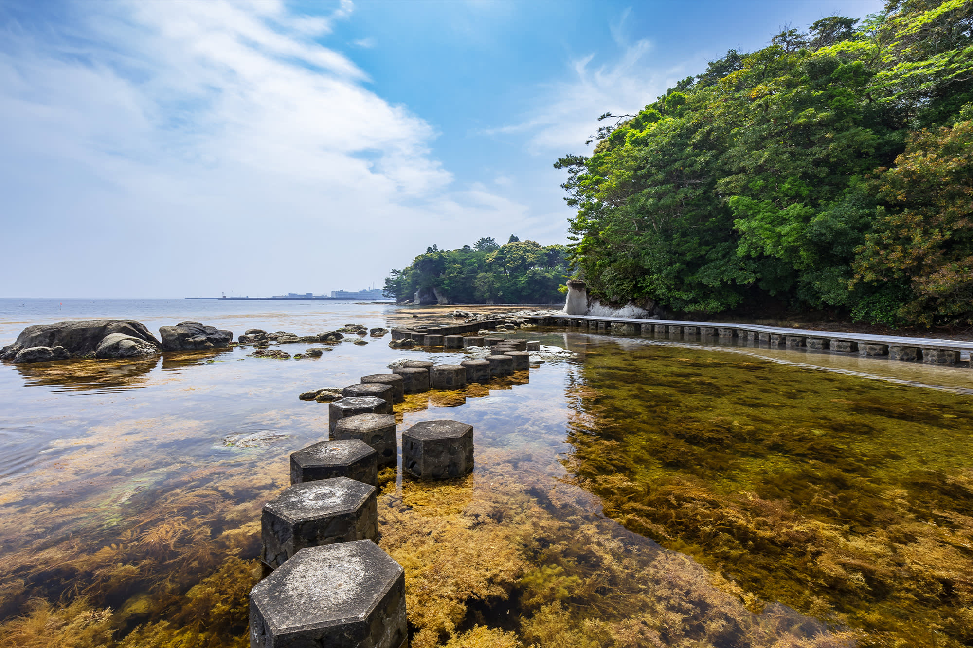 Tsukumo Bay is dotted with dozens of coves. Its coastline extends for 13 kilometers. The bay has a garden, Horajima Island, in the middle of calm, blue waters.