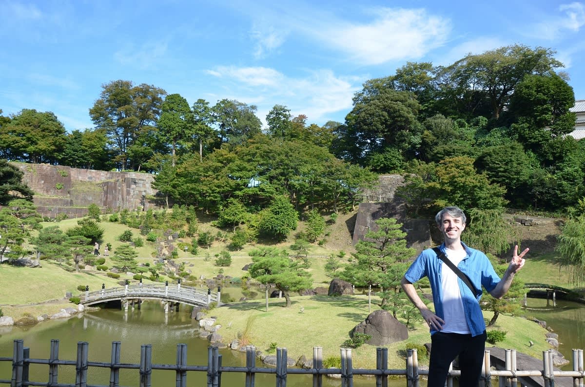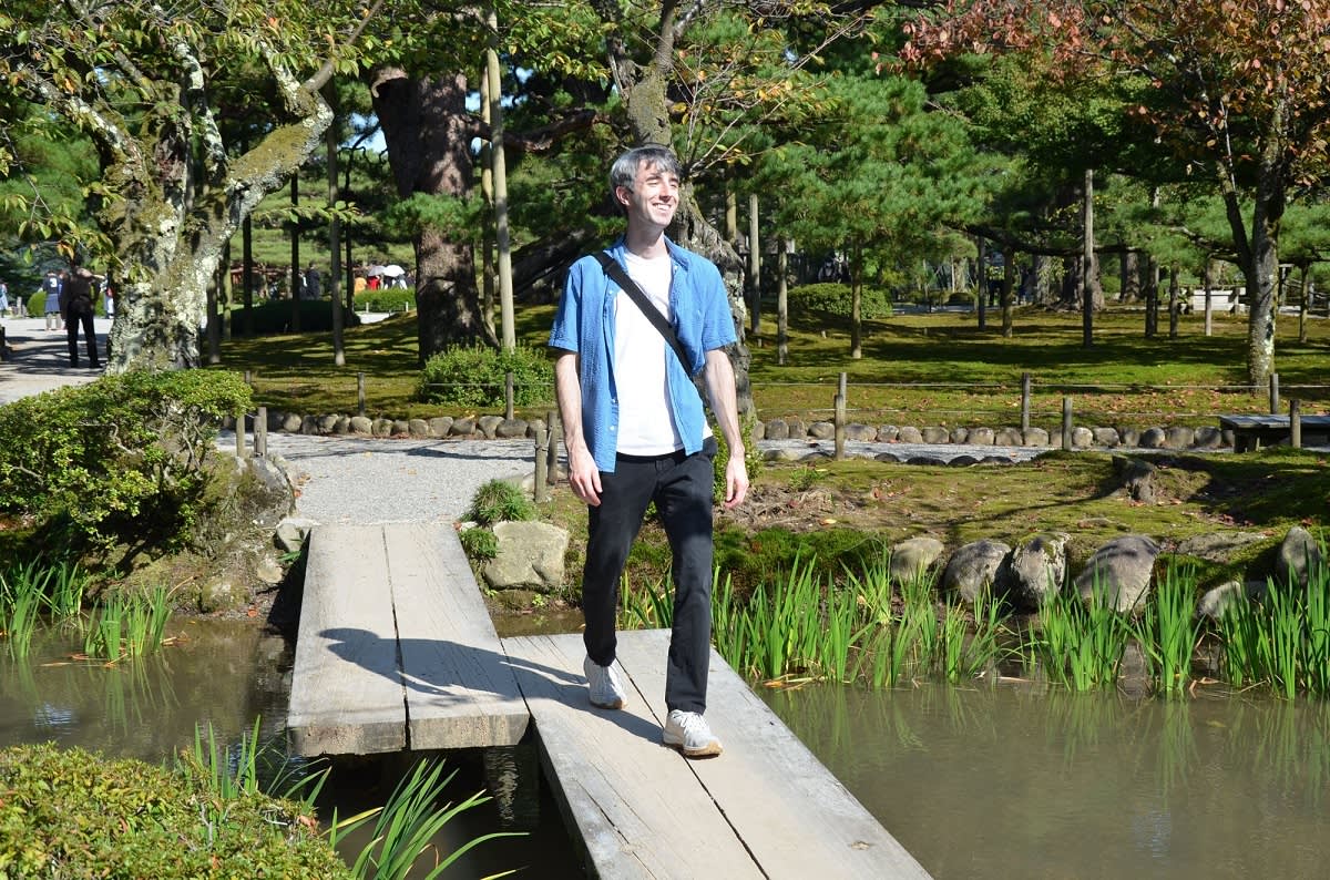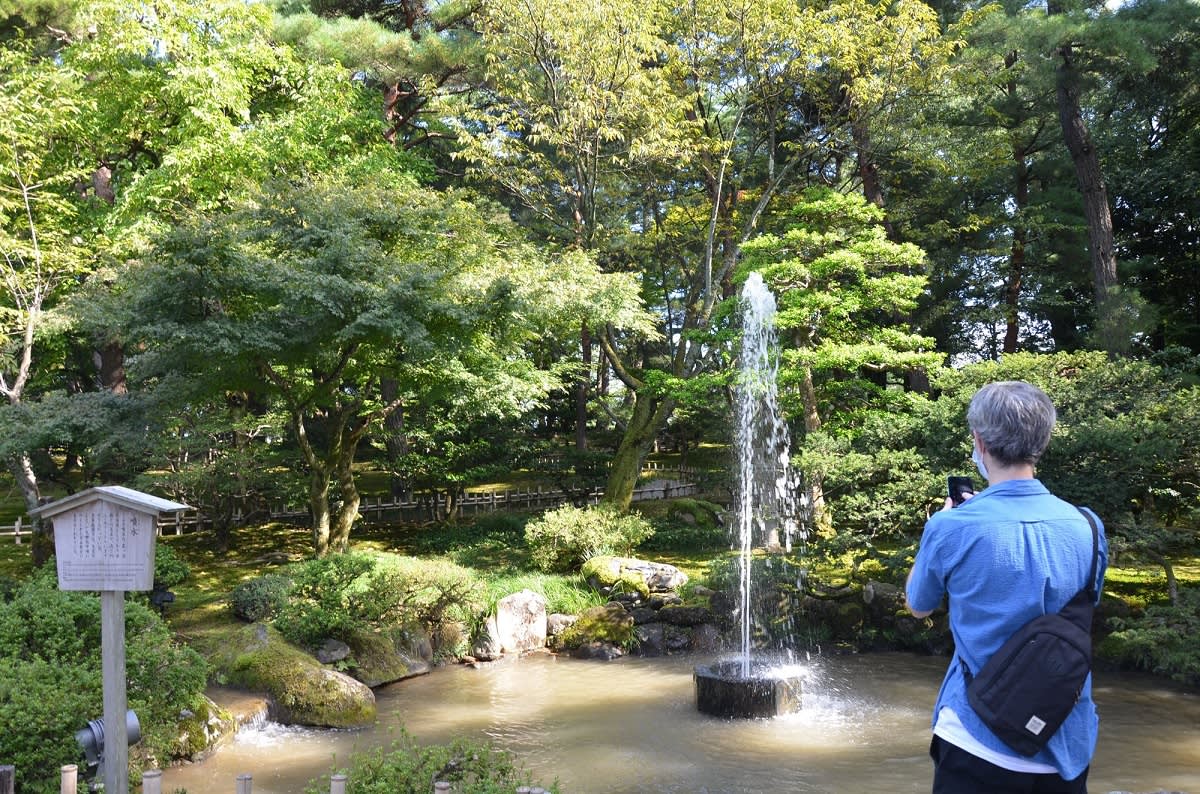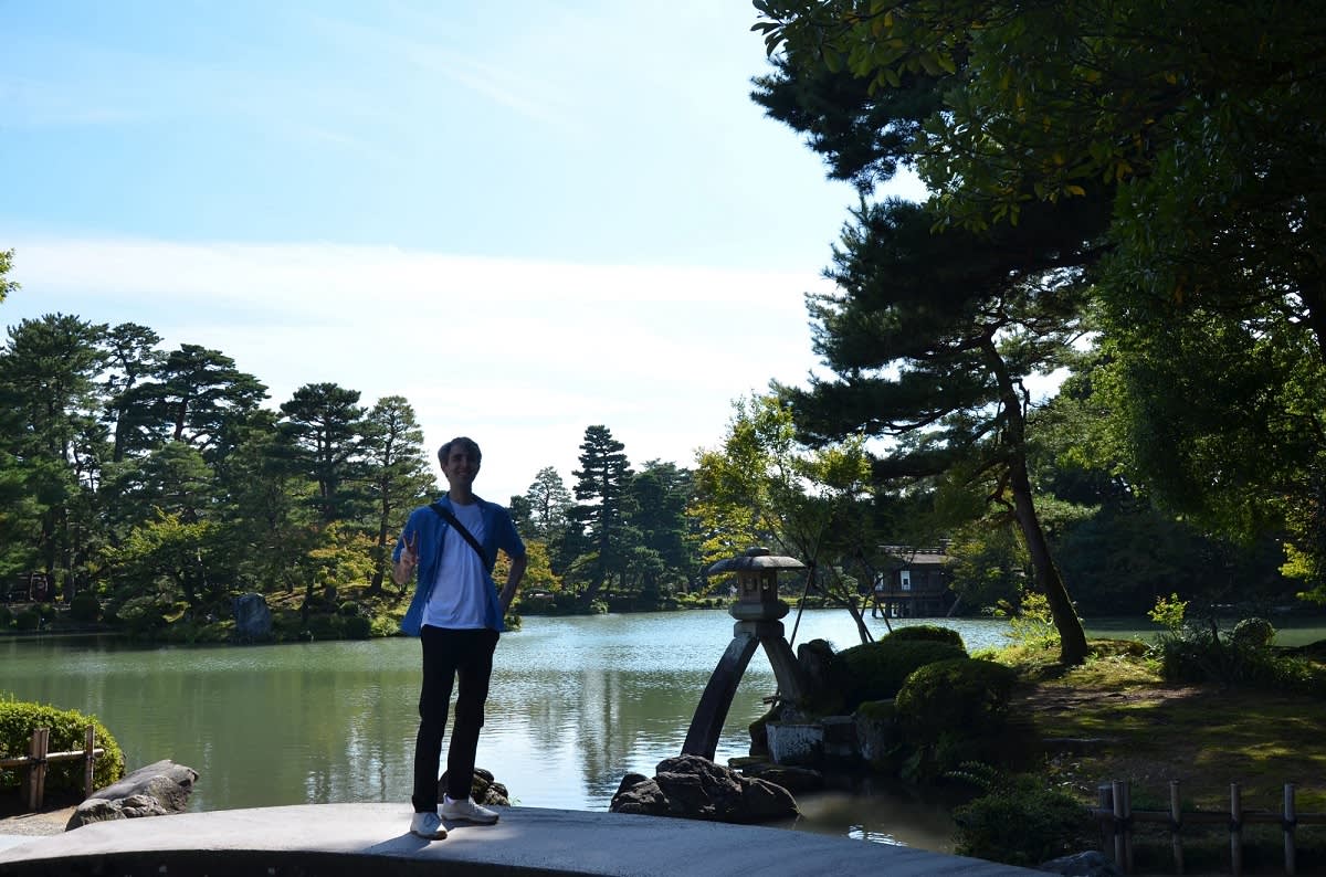 Having my fill of seafood, I got back on the bus and headed towards Kenrokuen Garden, a massive garden right next to Kanazawa castle. The plants were starting to get the tinge of red that the start of fall brings, but Kenrokuen Garden was still mostly an ocean of green. Cutting swaths between the trees was a network of small creeks reaching throughout the park like the roots of a massive tree. The streams flow into larger bodies of water, which provide a shimmering reflection of the surrounding greenery, and I spent a lot of time exploring these areas of Kenrokuen Garden. Near one of these ponds was a natural fountain, which I found to be particularly interesting since it relied purely on a difference in elevation between itself and the pond to spray water into the air at nearly double my height. The garden itself is several centuries old, with some of the trees themselves being well over one hundred years old. A lot of these older trees have grown so large that the branches require support from wooden posts. Looking at the curving path these branches cut through the air was fascinating, and goes to show how carefully manicured the grounds are.