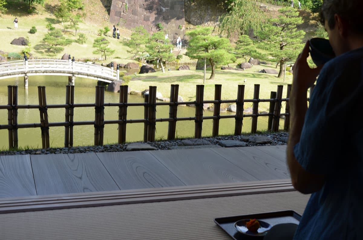 Strolling through the castle, I eventually arrived at my next destination, Gyokusen’inmaru Garden. In the center of which is a large pond surrounded by rolling hills dotted with rocks and vibrant pine trees. Across the tranquil surface of the pond rests a quaint teahouse, where I ended up having some hand-made green tea paired with an autumn inspired piece of Wagashi, Japanese Traditional Sweets. Sitting on the tea house’s veranda, I enjoyed the warmth and flavor of my tea while looking over the Garden. The piece of Wagashi complemented the slight bitterness of the tea, and its autumn inspired colors contrasted beautifully with the scenery outside the veranda. I took as much time as I could making sure to drink in my surroundings as slowly as my tea.