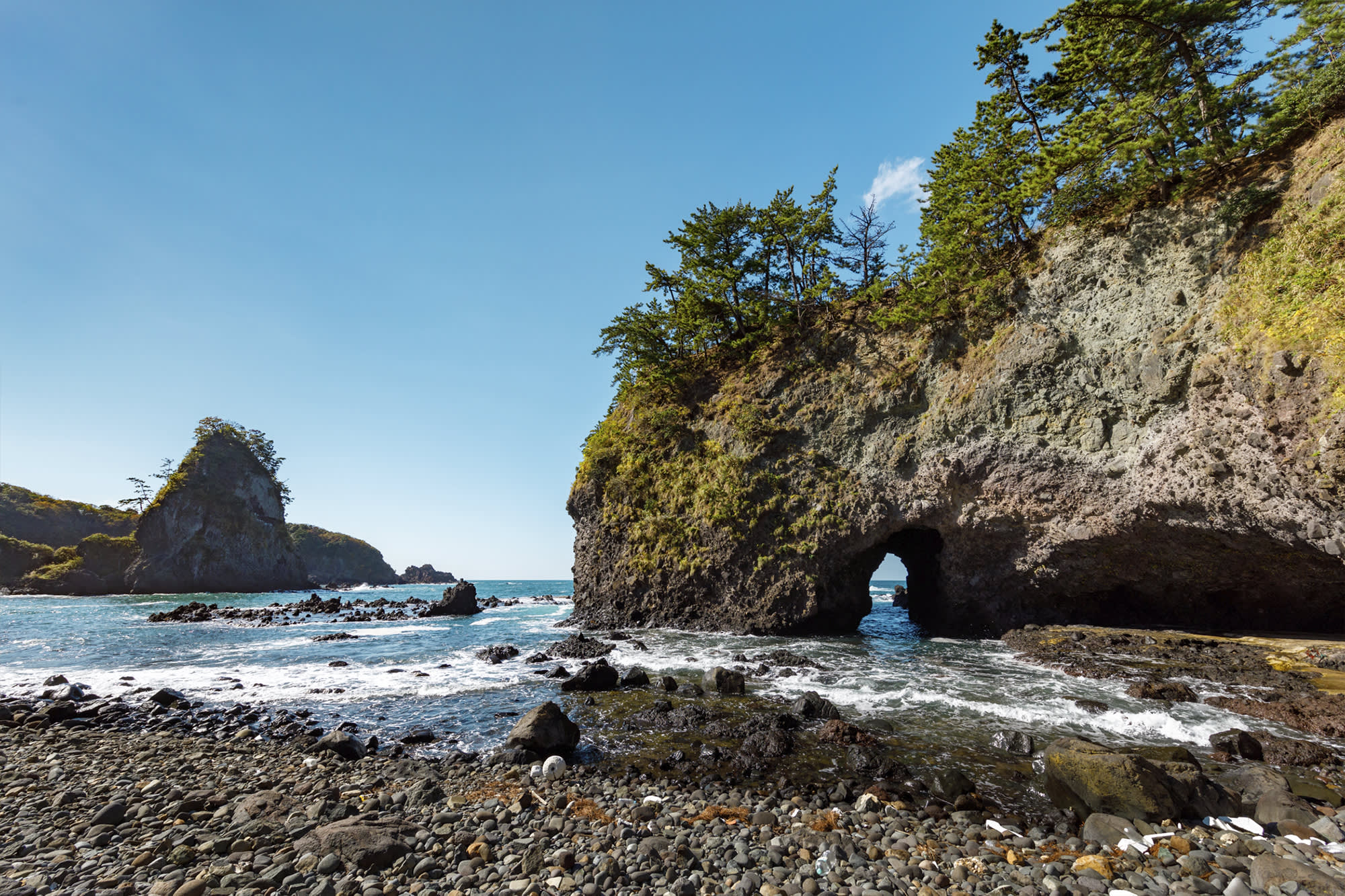 Much of Ishikawa's landscape is dominated by coastlines, particularly along the Noto Peninsula and the Kaga area. The terrain along the coast ranges from rocky and rugged to calm and sandy. Much of Noto's more rugged coastline has been eroded into otherworldly shapes, such as the Ganmon sea cave, the 28-meter-tall Mitsukejima rock island, and the window-like Madoiwa rock formation on the Sosogi Coast. Cape Rokko juts out of the tip of the peninsula and offers noteworthy sunrise and sunset views, while the Shiroyone Senmaida Rice Terraces slope majestically toward the sea. Visitors to Tsukumo Bay can board a boat to view the 13 kilometers of rias (sawtooth) coastline, dotted with dozens of calm coves.
