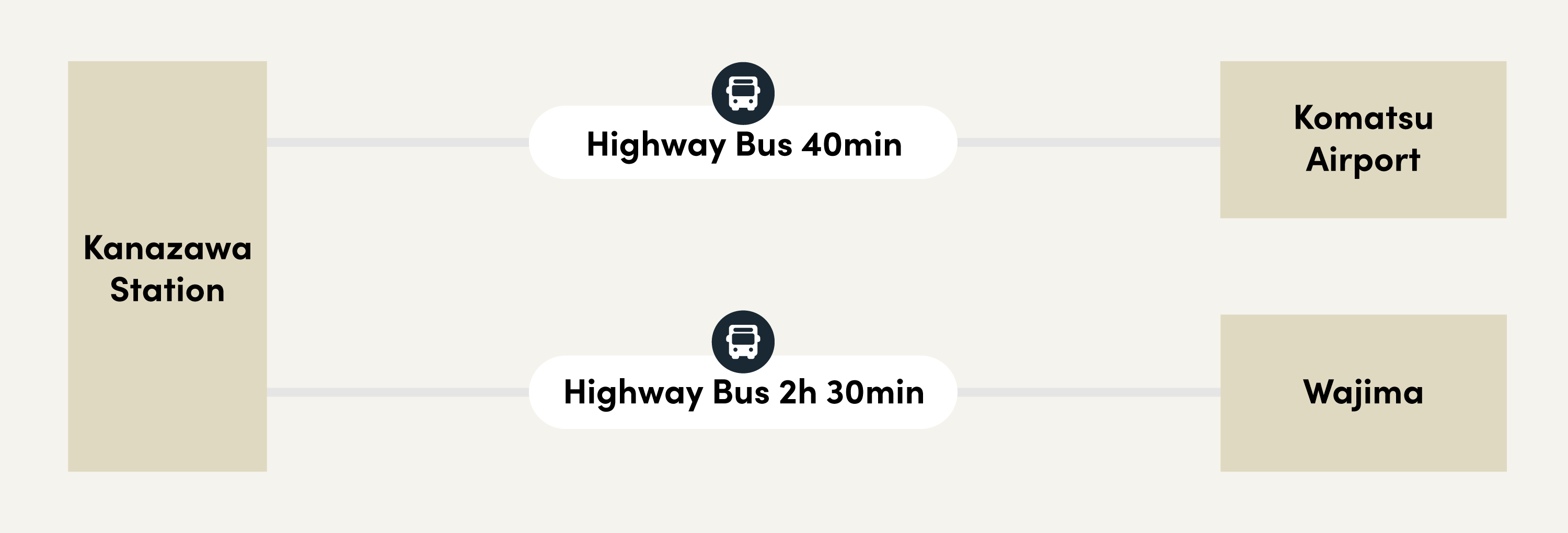 Highway bus routes connect more far-flung parts of Ishikawa with the capital. The route to Komatsu Airport takes about 40 minutes. Buses up the Noto Peninsula to Wajima and Suzu take about 2.5 hours and 3 hours, respectively. Seating on these buses is on a first-come, first-served basis.