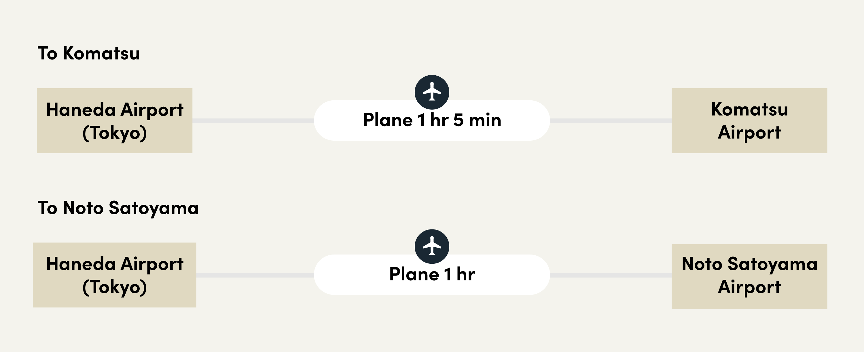 Ishikawa Prefecture is accessible by bullet train (shinkansen) from Tokyo and Tsuruga in southern Fukui Prefecture. JR limited express trains operate from Osaka, Kyoto, and Nagoya, stopping at Tsuruga for onward shinkansen connections to destinations in Ishikawa. The main gateway to Ishikawa is its capital, Kanazawa. Two airports serve the prefecture, Komatsu Airport and Noto Satoyama Airport. Shirakawa-go, a village in Gifu famous for its thatched roof architecture, is a short bus ride or drive from parts of Ishikawa.