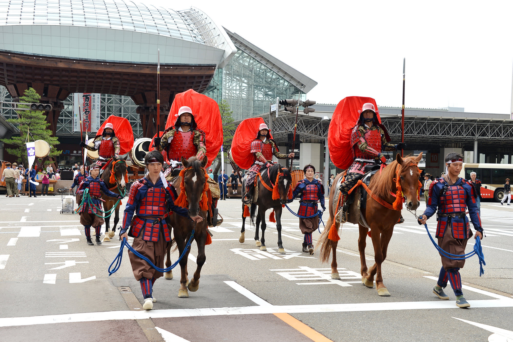 The Hyakumangoku Festival, held the first weekend in June, is Kanazawa’s biggest celebration of the year. This festival is a chance to experience many traditions that have been handed down from the era of the Kaga domain, which lasted from 1583 to 1869 and included present-day Ishikawa. The event commemorates the entry of Maeda Toshiie (1537–1599), the first lord of the Kaga domainKaga domain, into Kanazawa Castle on June 14, 1583.