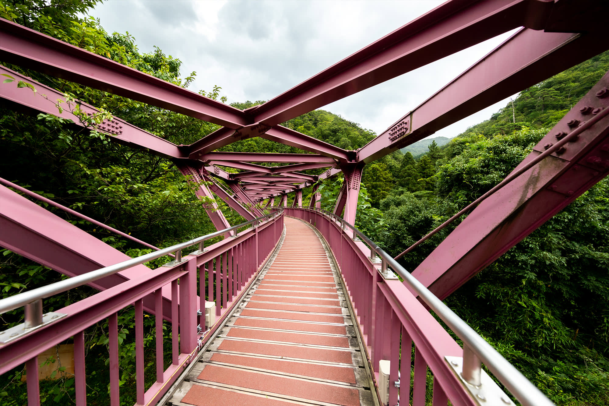 The best-known of these bridges is the Ayatori Bridge, a wine-red, S-shaped trestle bridge that winds across the river. Ayatori Bridge, or “Cat’s Cradle Bridge,” is so named for its resemblance to the children’s game. The bridge is illuminated in various colors each evening from April until the end of snow season. Near Ayatori Bridge is a cafe with seating on platforms built over the river (April–November).