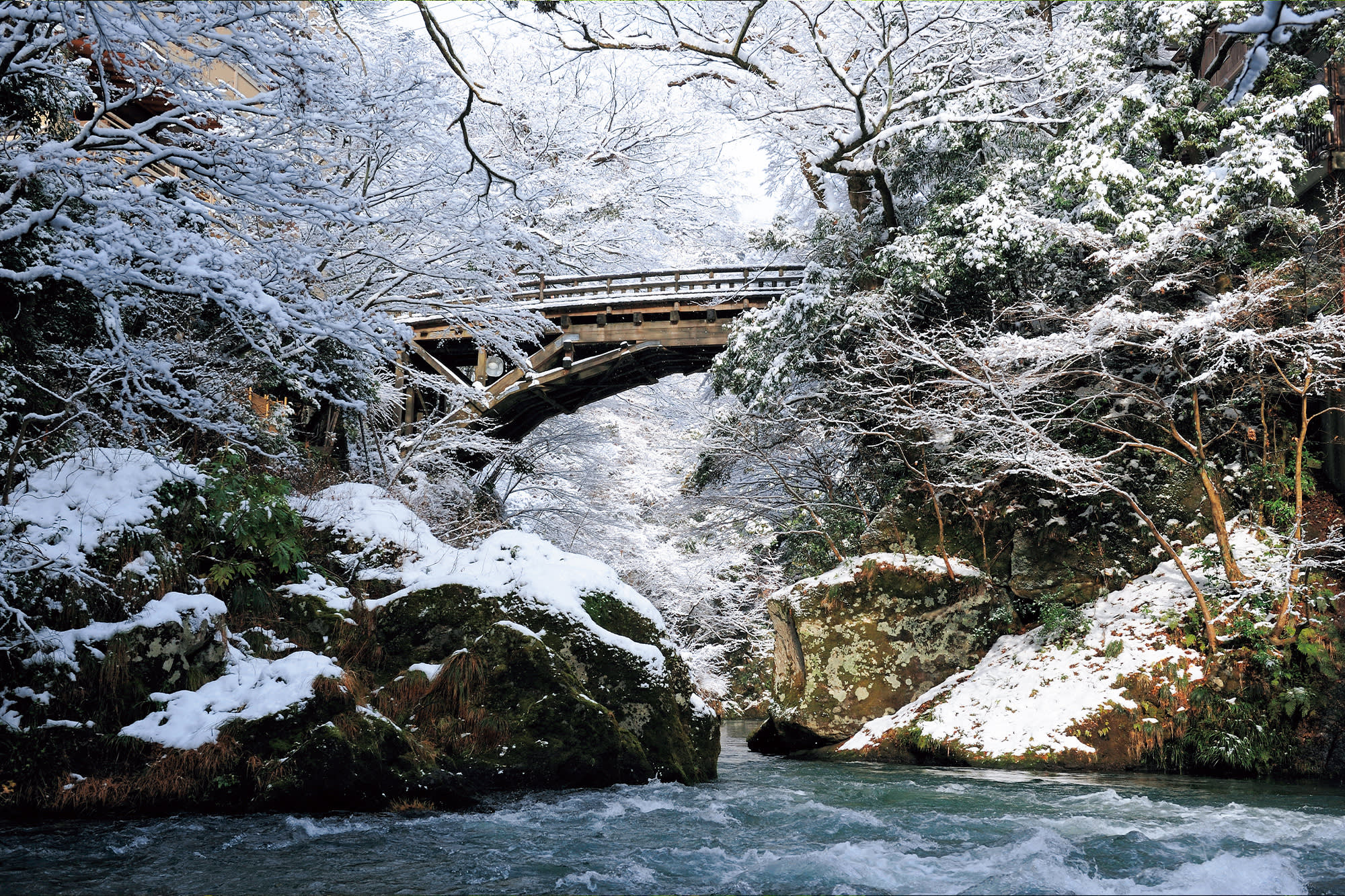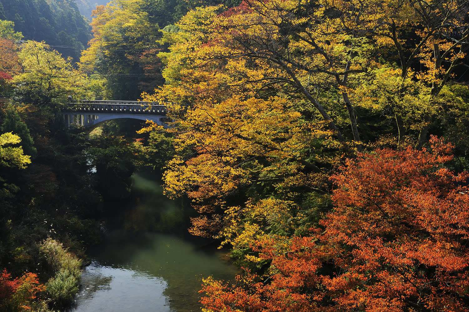 Kakusenkei Gorge is a stretch of the Daishoji River that runs through lush forest near the hot-spring village of Yamanaka Onsen. The 1.3-kilometer gorge runs from Korogi Bridge to Kurotani Bridge. Its peculiar rock formations form year-round scenic views that change with the seasons.