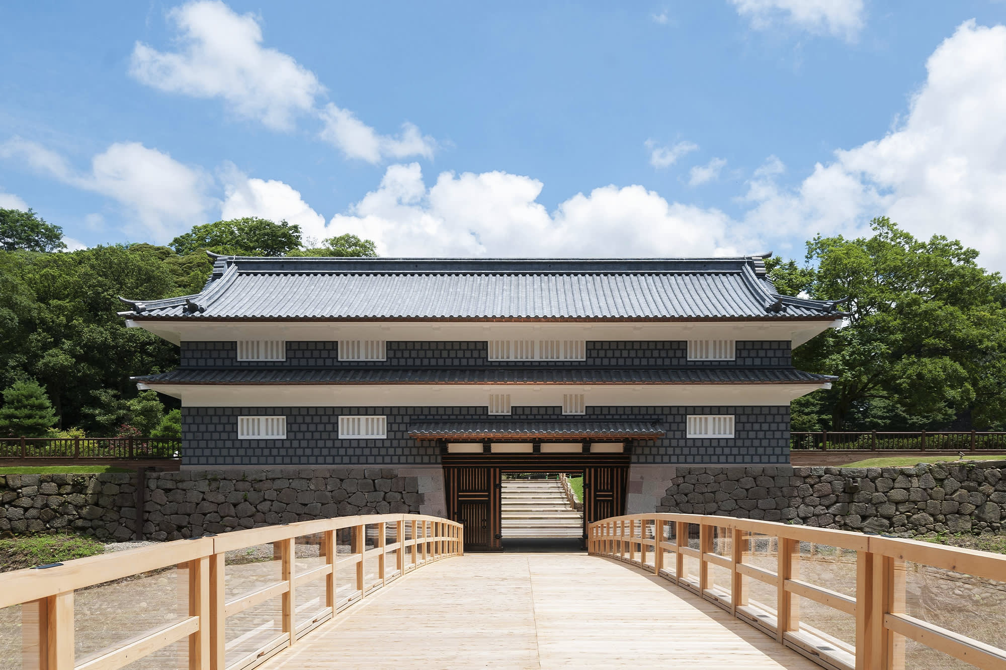 Reconstruction of Nezumitamon Gate on the western part of the castle walls, and Nezumitamon Bridge, which leads to the gate, was completed in July 2020, following an extensive archaeological study. The wooden walls of Nezumitamon Gate are covered in distinctive gray tiles joined by raised black plaster. Nezumitamon Bridge was historically one of the largest wooden bridges on the grounds, spanning a moat that separates the castle with an area that now holds Oyama-jinja Shrine.