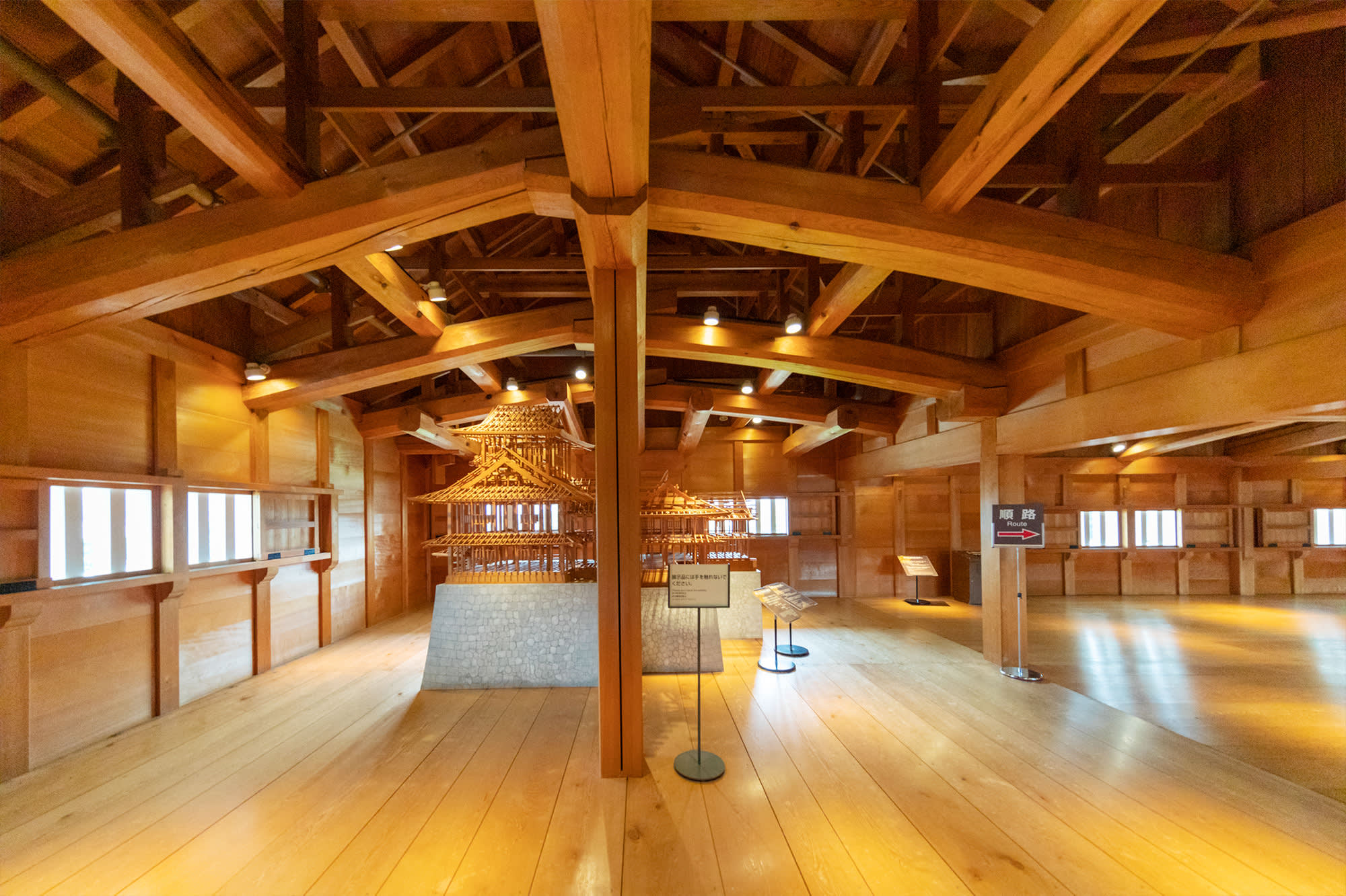 The rebuilt structures include two tall turrets with panoramic views over Kenrokuen Garden and the city of Kanazawa. The Hishi-Yagura turret is diamond-shaped rather than rectangular, a display of the Kaga domain’s wealth and engineering prowess. The two turrets and connecting storehouse were constructed by traditional woodworking methods, but equipped with an elevator and stairlift for added accessibility.