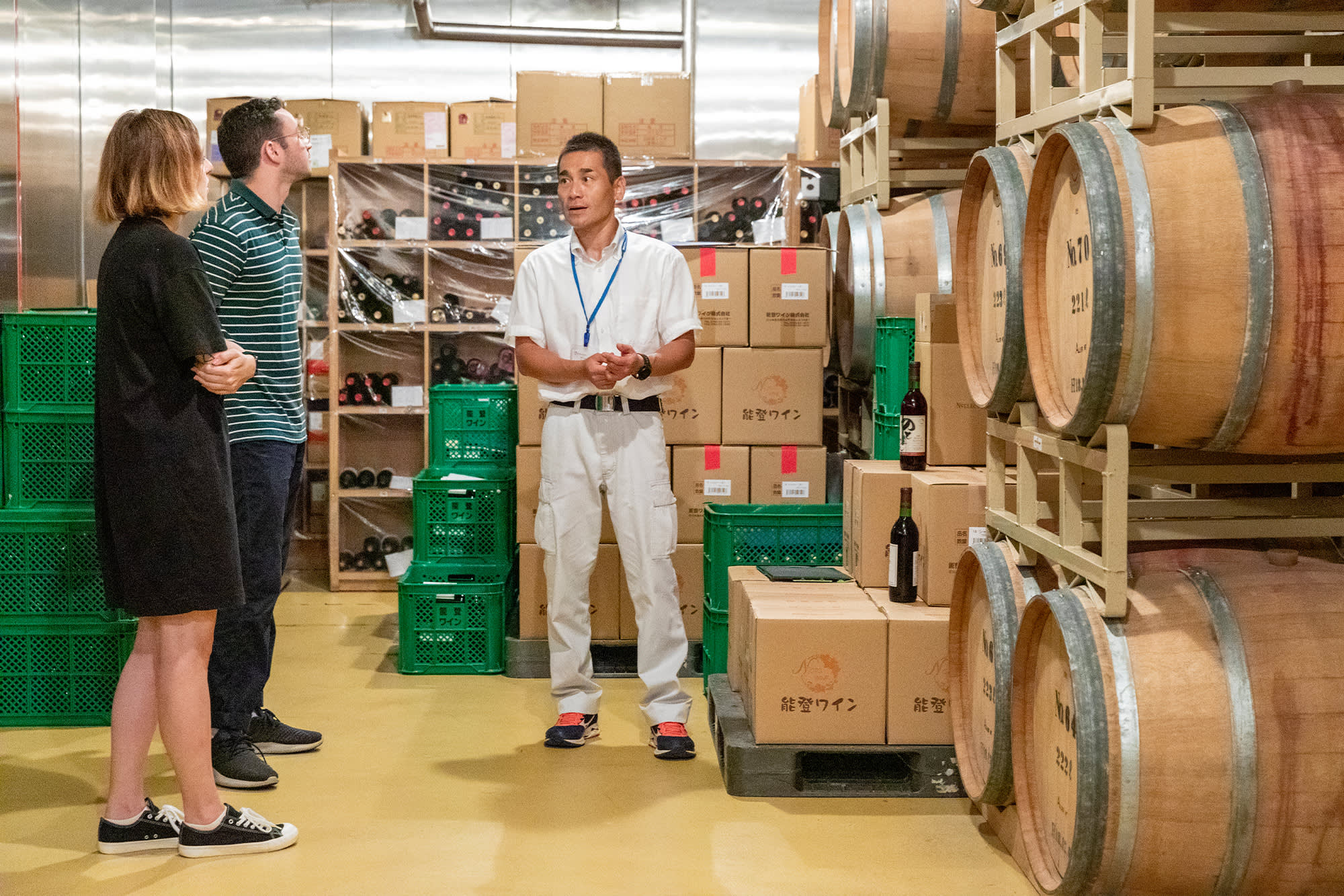 Noto Wine is Ishikawa's first winery, founded in 2004. Its vineyards are spread among the rolling hills of the town of Anamizu, drawing on fertile soil enhanced with oyster shells from the nearby bay. Nearly a dozen grape varieties are grown at the winery, including internationally famous varietals and local hybrids. Visitors can view the vineyards, watch parts of the production process, taste a range of wines, and buy some to take home.