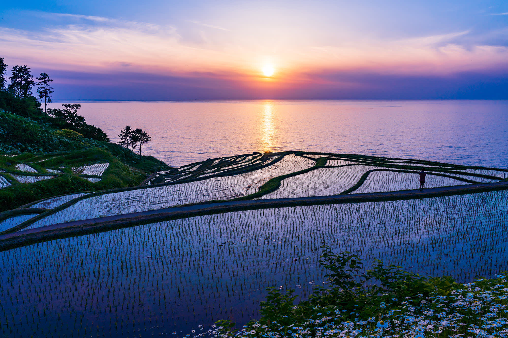 Zig-zagging, hillside rice paddies contrasting with the blue sea form a view that draws photographers from around the world to the Shiroyone Senmaida rice terraces.