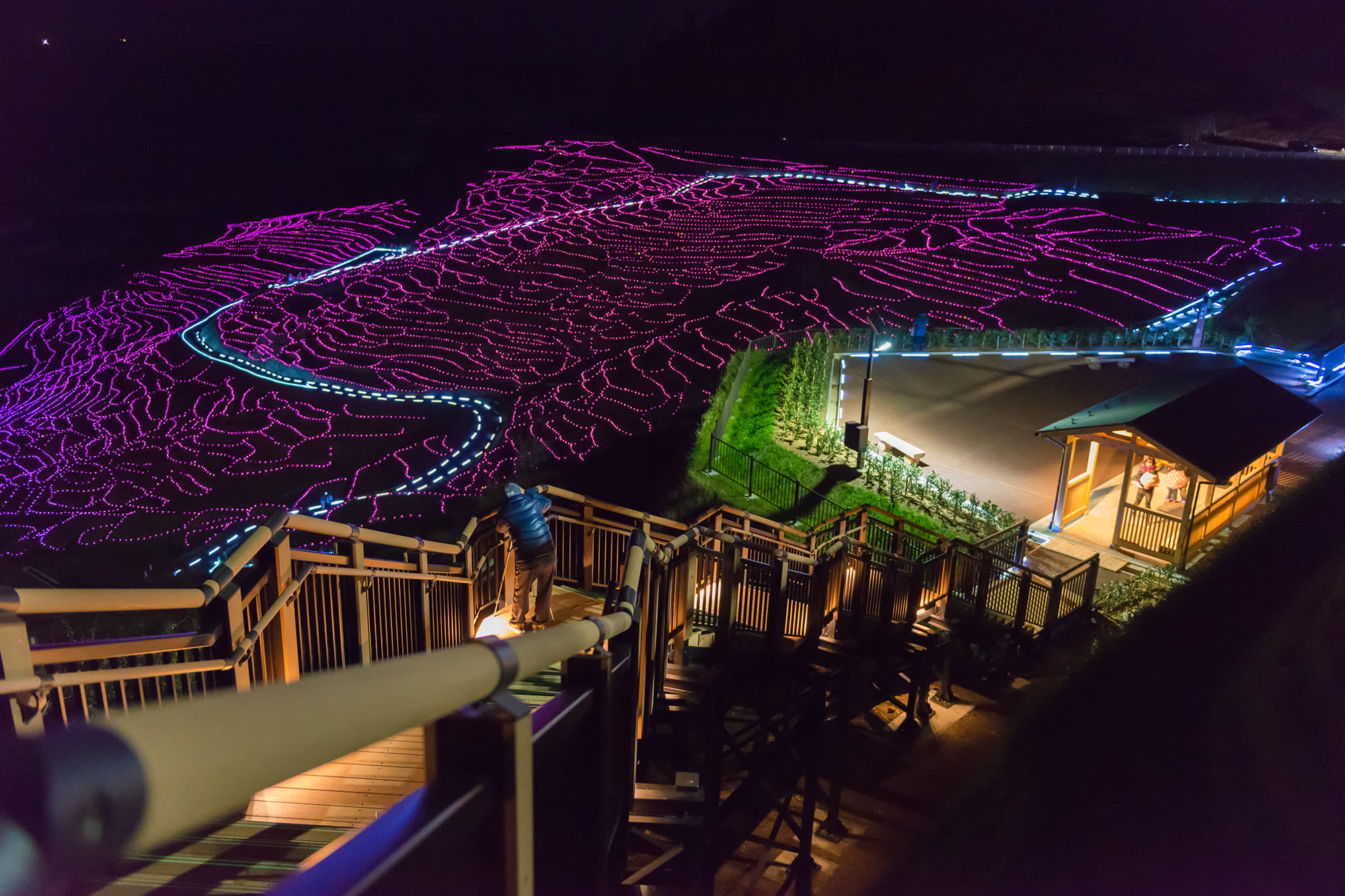 The beauty of Shiroyone Senmaida changes dramatically with the seasons. In January and February, the hillsides are often covered in white snow. From the end of April to July, the sunset reflected on the water of the flooded rice paddies creates an infinity pool effect with the sea as the backdrop. In the summer, the fields turn a striking green before ripening to gold in August and September. In warmer months, traditional wedding ceremonies are sometimes held at the rice terraces. Couples who get married there are blessed by the Shinto kami of rice paddies. From mid-October to mid-March, after the rice has been harvested, the terraces are illuminated at night with 25,000 solar-powered, color-changing LED lights.